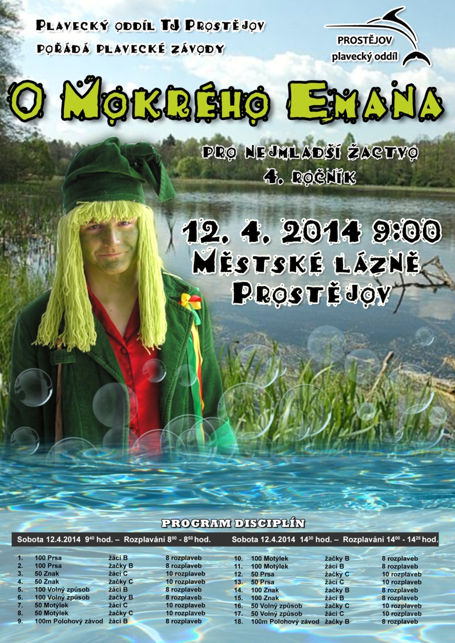 Ukončili jsme losování na závody „O mokrého Emana 2014“. Vzhledem k tomu, že byl velký počet přihlášených plavců, probíhalo losování ve dvou kolech. V prvním byli vyřazeni plavci bez žádného přijatého startu. V druhém kole byli vyřazeni plavci pouze s jedním přijatým startem. Bylo přijato celkem 273 plavců, co je na možnost 25-ti metrového bazénu v Prostějově velký počet. Musíte počítat s tím, že bude problém s místy na bazéně. Závodníci i trenéři budou muset využít všech prostor, tedy i vestibulu. Zároveň Vás prosíme o upozornění rodičů, že závody jsou pro děti, a prostor pro rodiče bude minimální. Budeme se snažit v první řadě zajistit prostor pro závodníky. Do skříněk v šatně budou muset jít děti po dvou. Ranní rozplavání bude rozděleno, první začínají chlapci (8:00-8:25) poté dívky (8:25-8:50).